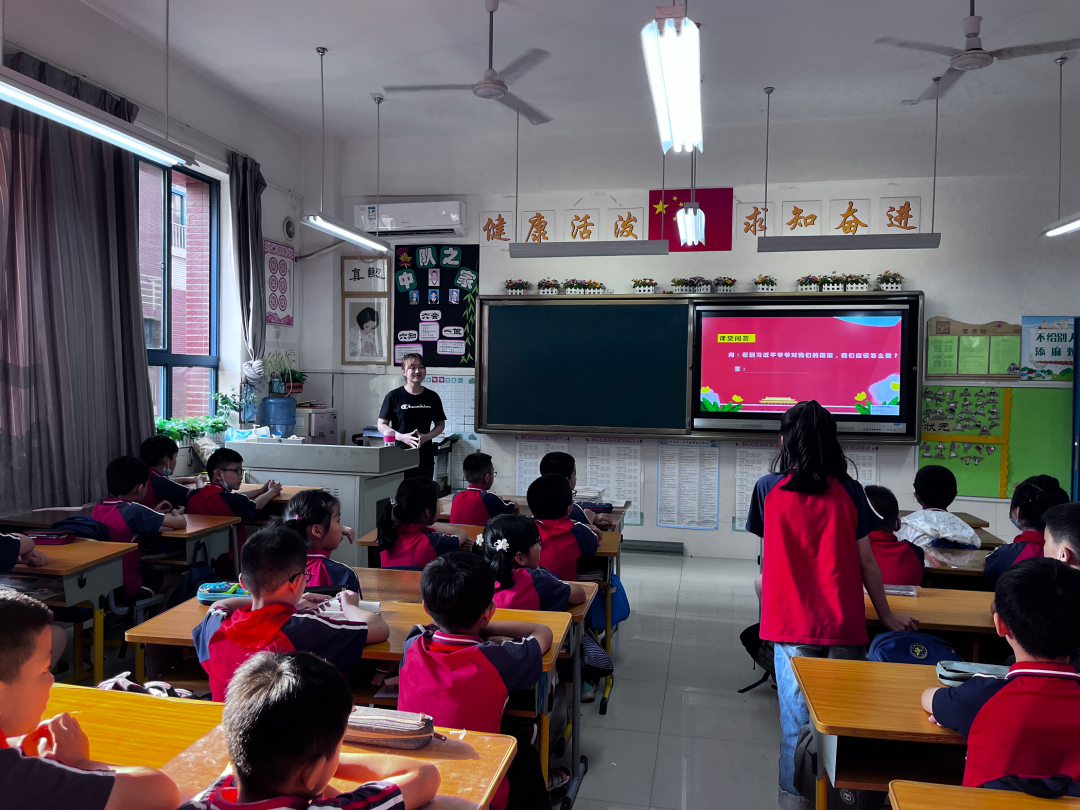高翔通过介绍奥运冠军全红婵夺冠背后的故事,让同学们从自己的同龄人身上体会其优秀品质。在互动提问环节中,同学们从热爱祖国、孝敬父母、热心公益等多个方面谈及自己对如何做一名新时代好少年的看法,并表示在今后生活学习中会心有榜样、从小做起,争做一名优秀的少先队员。