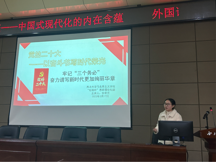 张依芳同学以《牢记“三个务必”奋力谱写新时代更加绚丽华章》为题,向大家介绍了“三个务必”的内涵以及在开拓新征程中始终坚持“三个务必”的实践路径,新时代、新征程,须牢记“三个务必”,以史为鉴,面向未来,在不断自我净化中推进中华民族伟大复兴!