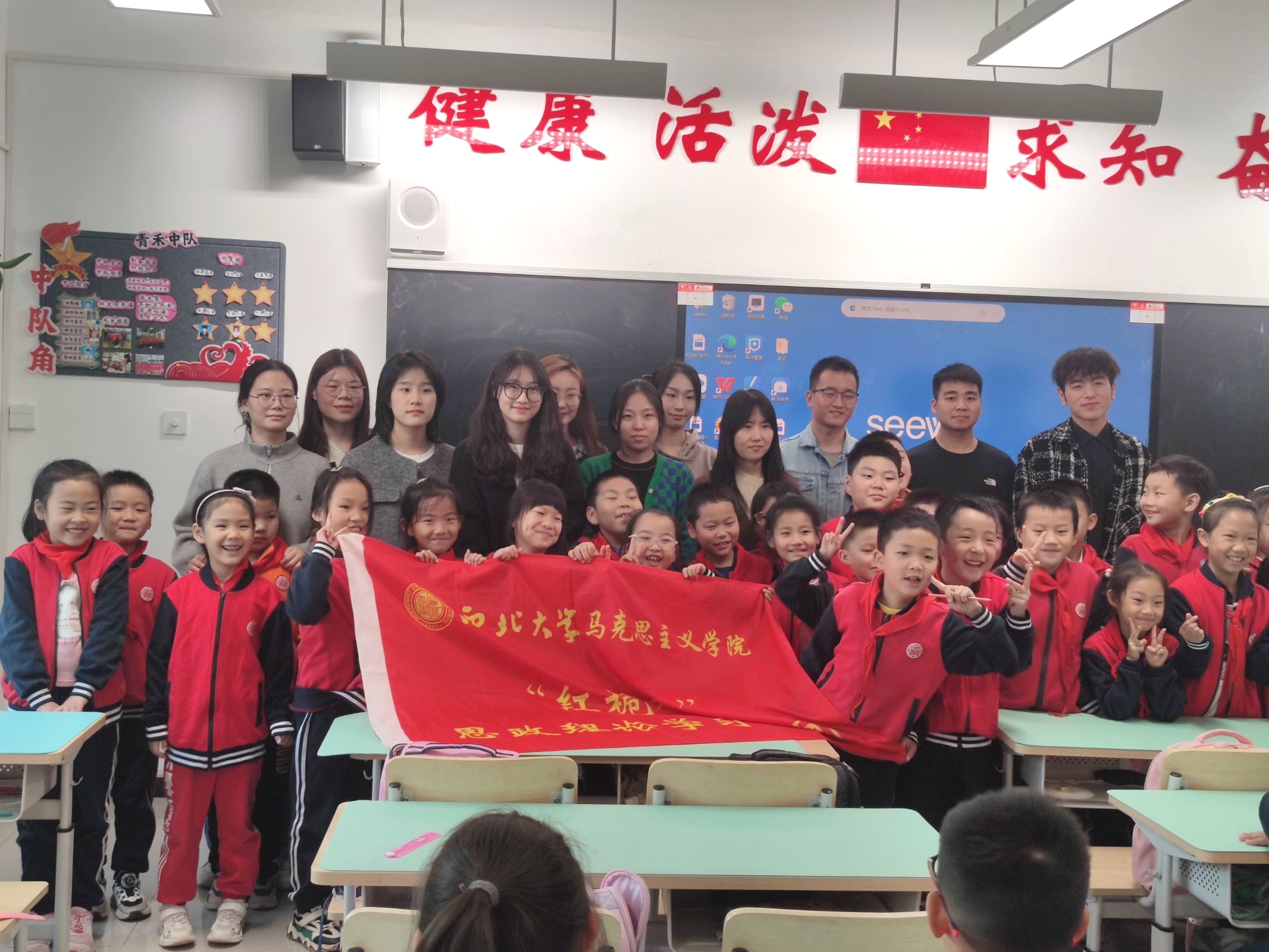10月20日,我院“红桅杆”思政理论学习社团在西北大学附属小学,以《习近平新时代中国特色社会主义思想学生读本》(小学低年级)为主要内容,为二年级的小学生讲授思政课。主讲人分别是来自2022级和2023级的马克思主义基本原理、思想政治教育、马克思主义中国化研究与中国近现代史基本问题研究专业的12位硕士研究生。