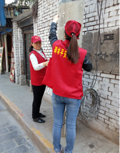(图为党员协助社区工作人员固定散落的电缆)